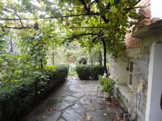 The garden is planted with a vine yard, fruit trees, a box tree and flowers.