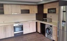 A huge furnished kitchen with electrical appliances, dining area, living room, bedroom a shower room with toilet and large cellar.